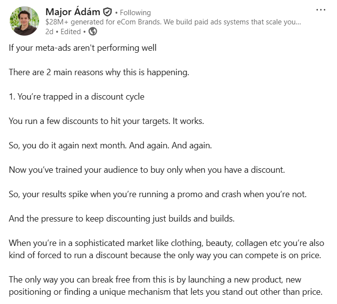 Why it happens - Discount cycles train customers to wait, so ads only work when a promo is running. In crowded categories, brands end up competing on price instead of differentiation, which collapses long-term efficiency. At the same time, weak pixel and event matching data makes Metaâs targeting inconsistent, because the system canât reliably find buyers.