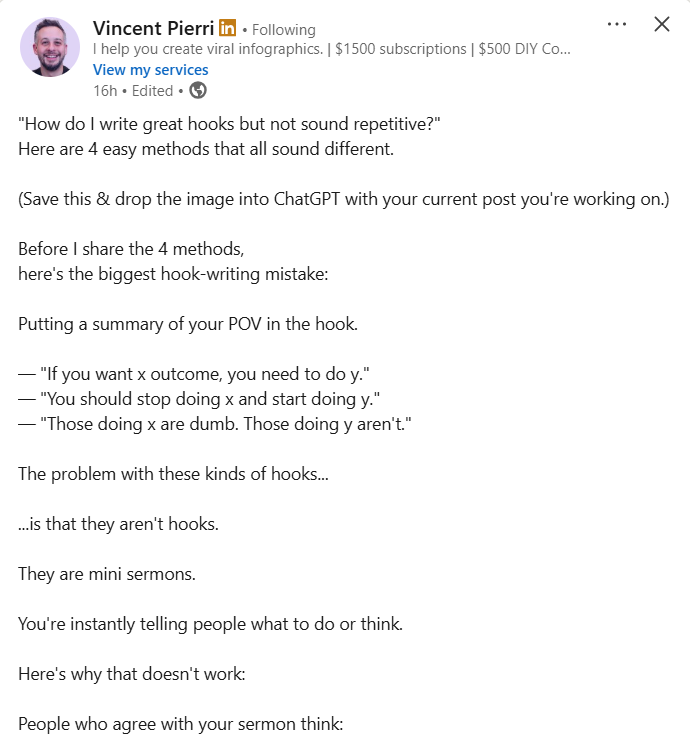 The real takeaway: Hooks aren’t about being profound. They’re about earning the click. Give people the promise of value, not the lecture. Let the post do the convincing.
