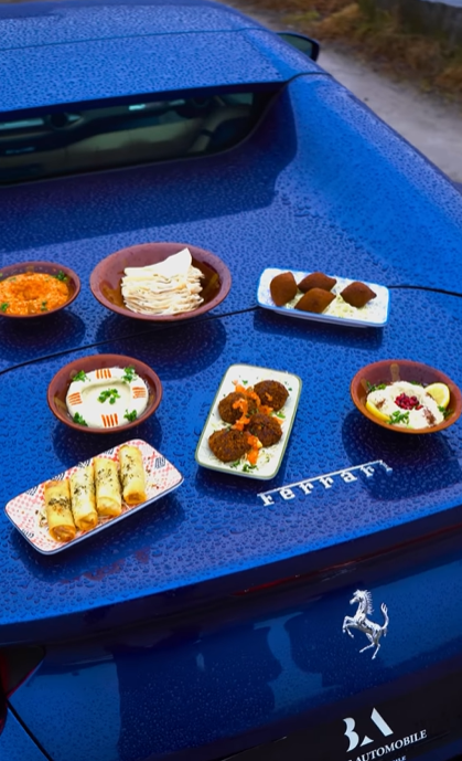 2. The Ferrari trunk feels like a luxury dining table - When the food appears on that deep blue Ferrari, something shifts. It suddenly feels premium. The car’s status transfers subtly to the brand without anyone saying “high quality.”