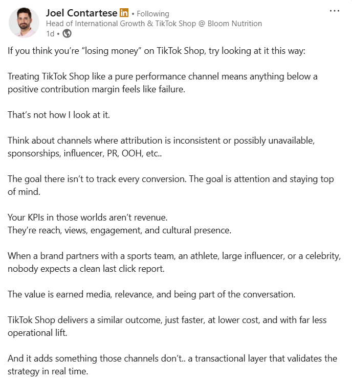 TikTok Shop feels frustrating when it’s judged like Meta, where every dollar needs a clean contribution margin. But it behaves more like an influencer or PR, messy attribution, huge attention upside, and value that shows up everywhere else, not just in last-click revenue.