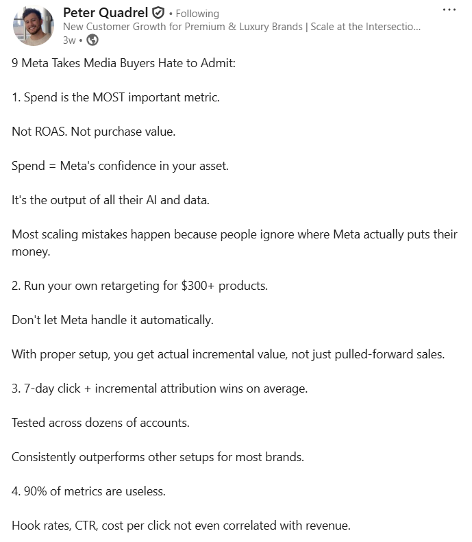 This list cuts through a lot of comfort metrics and tooling myths. At scale, Meta doesnât reward what looks good in dashboards; it rewards what it can confidently push spend behind. Ignoring where Meta allocates budget is usually why accounts stall.