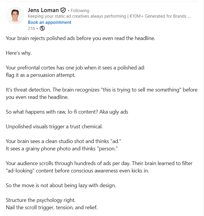 Where it needs balance: Lo-fi doesnât automatically mean effective. Poor messaging or weak hooks still fail. Overusing âuglyâ ads can also harm brand perception, especially for premium products that rely on a strong visual identity.