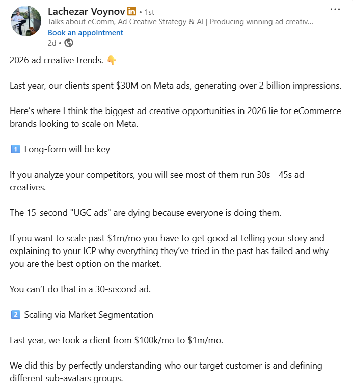 Why this works: Short UGC ads blend into the feed now. Longer creatives give room to explain why old solutions failed and why you’re different. Segmentation keeps messages relevant without saturation. Educating higher awareness stages builds trust and unlocks demand most competitors ignore because it takes real effort.