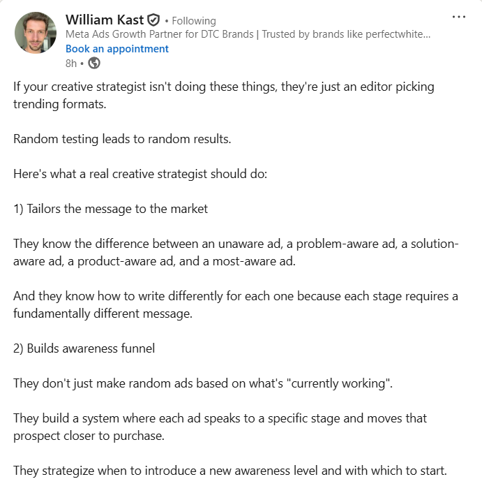 This post defines creative strategy as a structured system, not just producing ads. It emphasises aligning messaging with awareness stages, testing hierarchies, competitive gaps, and funnel fit. The strategist’s role is to guide what to say, who to say it to, and how it evolves across the funnel.