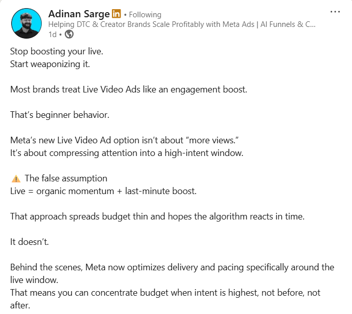 The real takeaway: The live itself isn’t the asset, the momentum is. Pre-warm audiences, focus spend during the event, then retarget immediately while attention is still fresh. Used casually, live is just content. Used intentionally, it becomes a controlled demand surge.