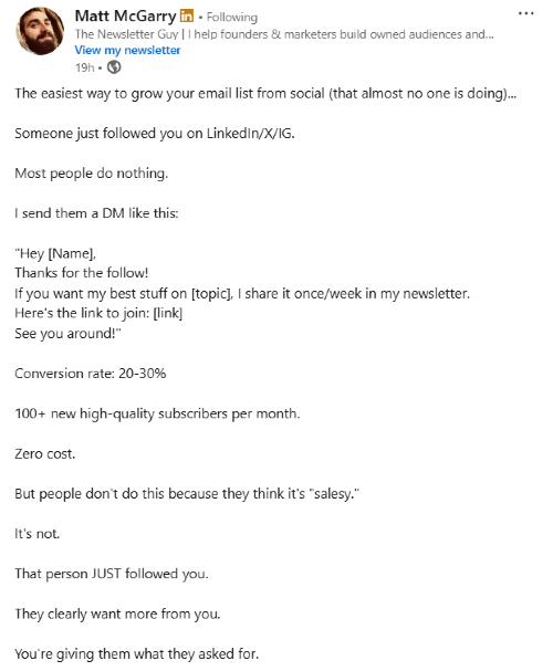 Most brands ignore new followers after they hit follow. A simple DM within 24 hours inviting them to your newsletter can convert 20 to 30 percent and drive 100 plus high-quality subscribers per month at zero cost.