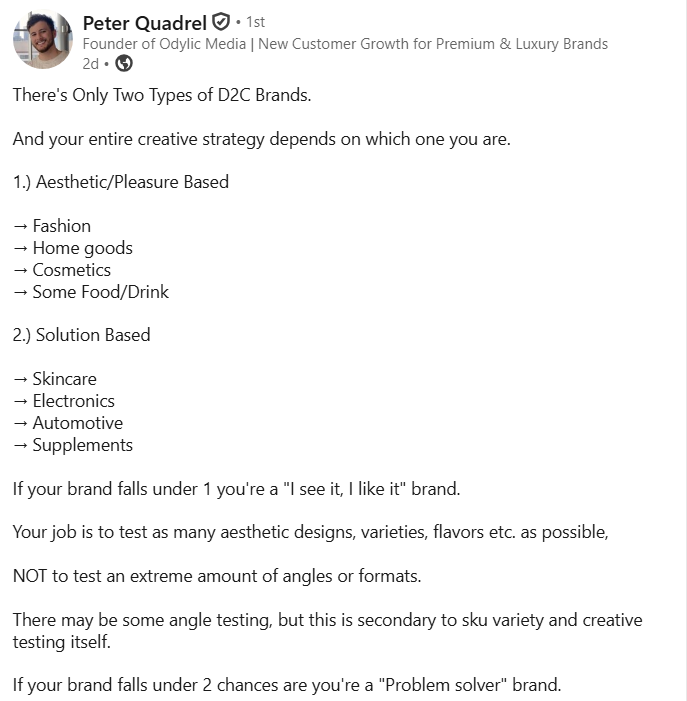This framework splits D2C brands into two core buying behaviors: aesthetic-driven and problem-solving. Instead of treating all brands the same, it argues that creative strategy should align with why people buy. The focus shifts from formats to underlying motivation, guiding whether to prioritize visual variety or messaging angles.