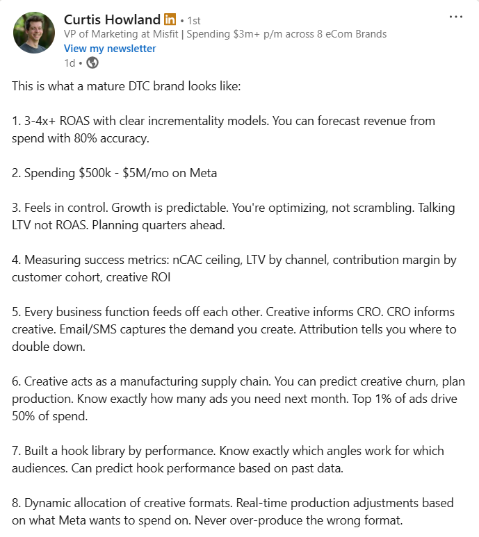 Maturity in DTC isnāt about big budgets or flashy ROAS screenshots. Itās about control. Revenue becomes forecastable, spend feels predictable, and decisions are driven by LTV, contribution margin, and incrementality instead of reacting to daily performance swings.