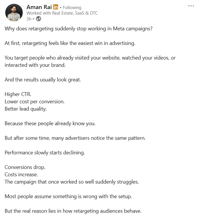 Retargeting audiences are finite because they consist only of people who have already interacted with your brand. Early performance looks strong because high-intent users convert quickly after seeing reminder ads.