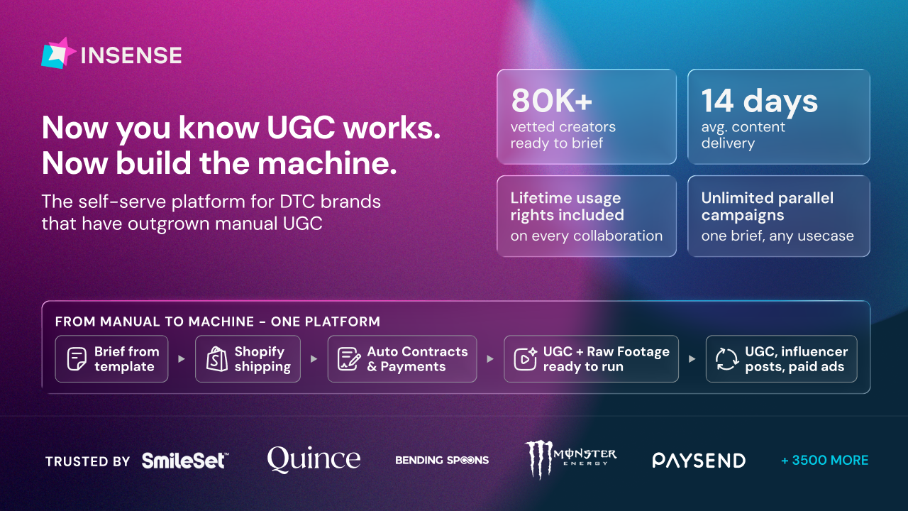 Over 3,500 brands and agencies trust Insense to fix exactly that. Get matched with high-fit UGC creators from an 80,000+ vetted pool across 30+ industries in under 48 hours, with full lifetime usage rights on every asset.