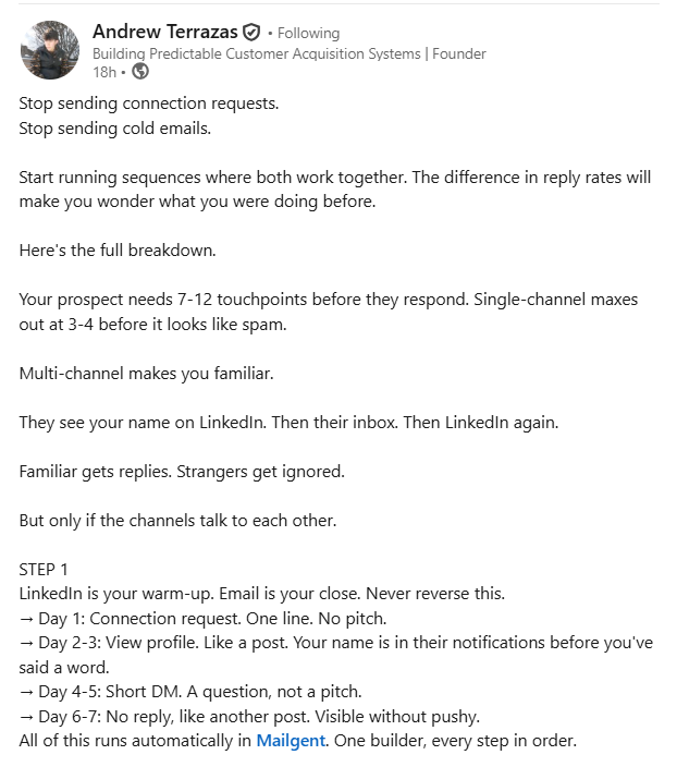 This strategy combines LinkedIn and email into a coordinated sequence instead of treating them separately. LinkedIn builds passive familiarity through low-friction touchpoints, while email converts once recognition is established. The system focuses on sequencing interactions so prospects experience repeated, connected exposure rather than isolated cold outreach.
