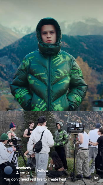 - Visual contrast carries the entire story. Neon splashes, moving hands, and a completely still model create controlled chaos around the jacket, positioning the product as stable, durable, and visually dominant.