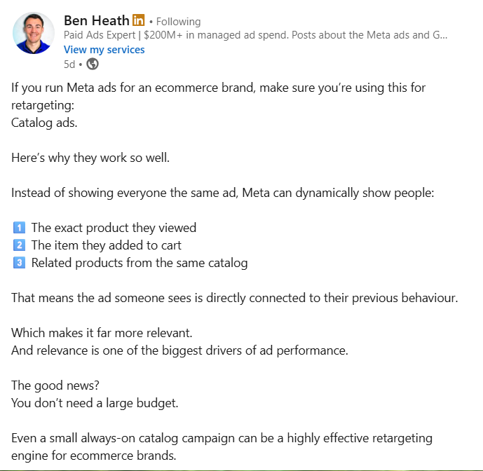Where it needs balance: Catalog ads rely heavily on clean product feeds and accurate tracking. Poor data quality reduces effectiveness. Overexposure can also cause fatigue, so frequency control and creative variation are still important.