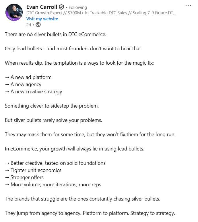 Why this works: DTC grows through repetition, not magic. Stronger offers, better creative, tighter margins, and more testing reps done consistently. These arenât exciting fixes, but they compound over time. Each improvement makes the whole system stronger instead of covering up cracks.