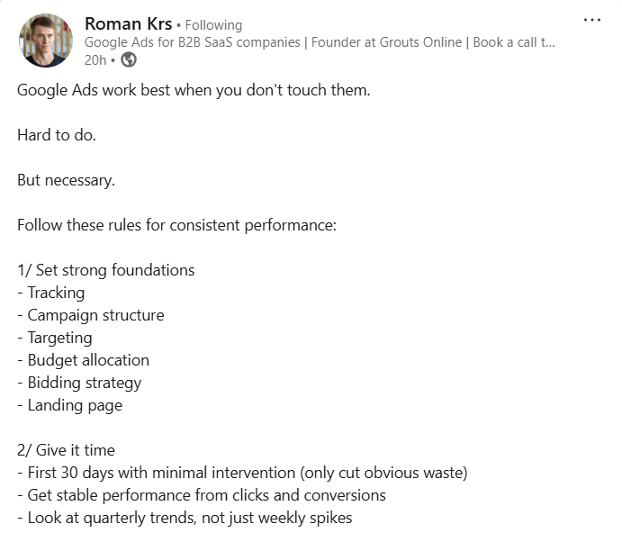This approach emphasizes restraint over constant optimization. Instead of frequent tweaks, it prioritizes a strong initial setup, allowing campaigns to stabilize and making fewer, more deliberate changes. The focus shifts from reactive adjustments to structured experimentation and long-term performance trends.