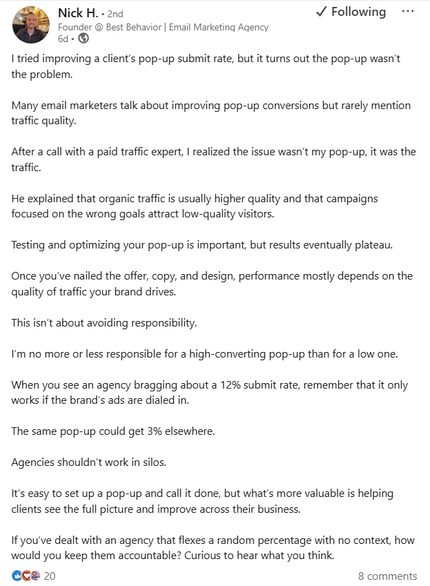 Where it needs balance - Pop-up teams still have responsibility. A poorly timed, overly aggressive, or misaligned pop-up can tank conversions even with good traffic. And strong testing on offers and timing can sometimes unlock surprising gains even after early plateaus. The message isnât âpop-ups donât matter,â itâs âpop-ups have limits when traffic is misaligned.â