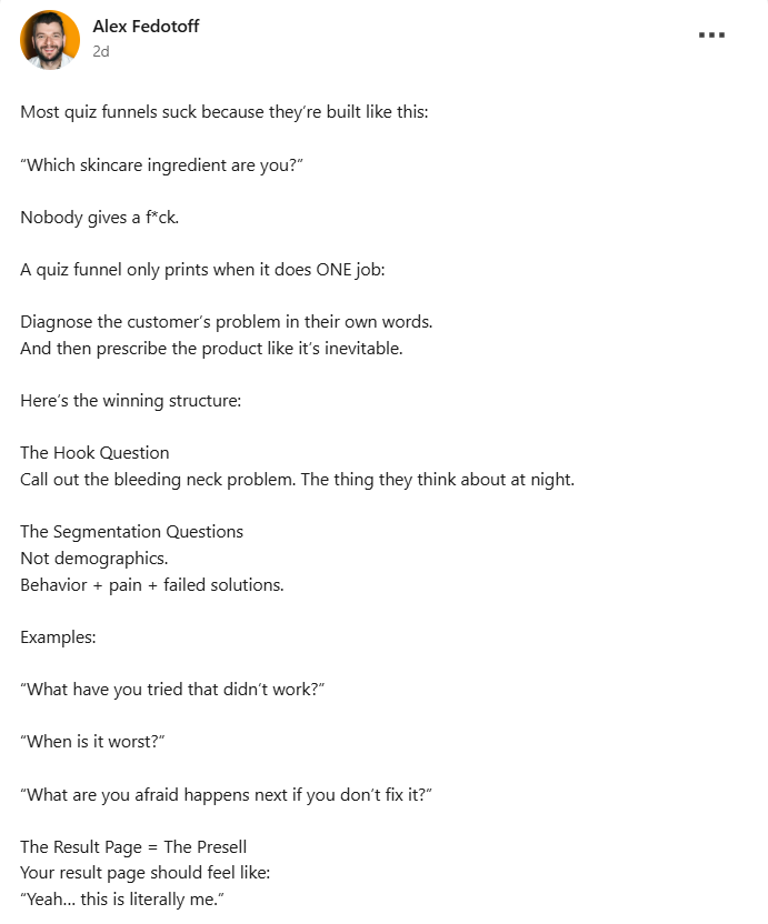 Quiz funnels fail when they focus on gimmicks instead of diagnosis. People don’t want to be categorized for fun, they want clarity on what’s wrong and what to do next. A quiz only works when it puts the customer’s problem into words they already recognize.