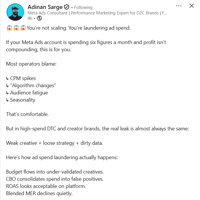 Where it needs balance: Too much validation can slow creative velocity and limit exploration. Not all MER drops come from ads alone; retention, inventory, and offer shifts matter. Diagnose holistically before cutting spending aggressively.