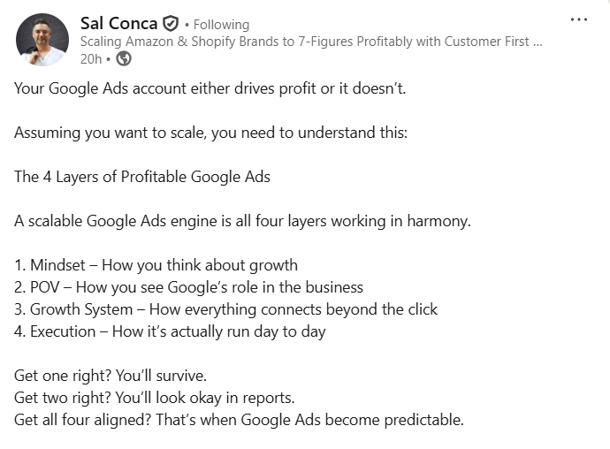 Why it works - When all four layers connect, performance stops feeling random. Mindset keeps you focused on profit, not vanity ROAS. POV makes Google a business lever, not just a traffic faucet. The growth system ensures landing pages, offers, retention, and measurement support the spend. Execution adds the guardrails that automation needs to scale without drifting.