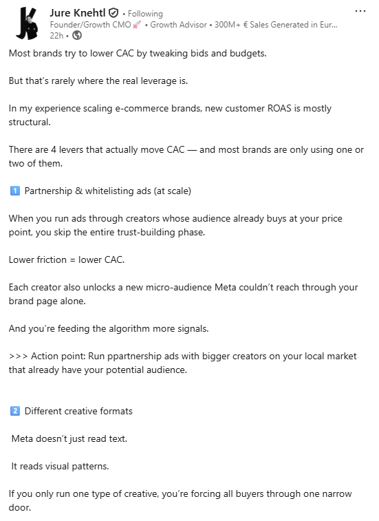 This strategy argues that CAC improvements rarely come from bid tweaks but from structural audience expansion. Partnership ads, creative diversity, persona targeting, and upper-funnel exposure widen the pool of qualified buyers Meta can reach.