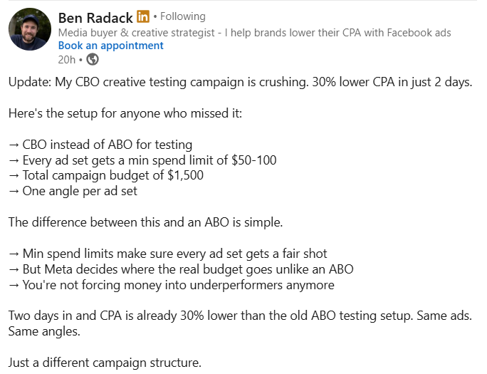This setup replaces ABO testing with CBO while still controlling spend using minimums per ad set. Each angle gets a fair initial budget, but Meta dynamically shifts spend toward top performers. The structure removes manual budget bias and lets the algorithm prioritize efficiency earlier.