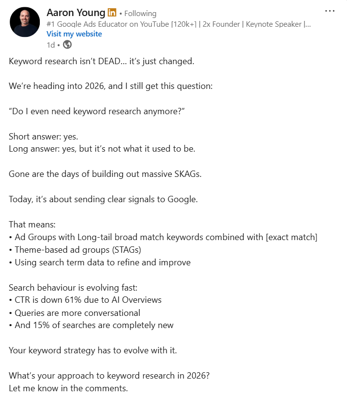 Keyword research still matters, but not in the old SKAG-heavy, control-every-term way. Search has shifted fast with AI Overviews, conversational queries, and constant new searches. Today, keywords are less about precision obsession and more about sending clear, consistent intent signals to Google.
