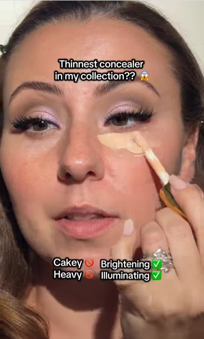 2. Objection Compression - Watch how fast objections get killed. In seconds, she clears “caky,” “heavy,” and “fake-looking.” That matters because under-eye concealer is a high-risk product, and removing doubt early directly lifts saves and clicks.