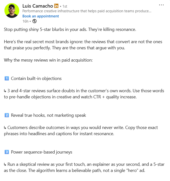 Why it works: Buyers trust content that reflects their own doubts. Imperfect reviews feel authentic and reduce resistance by addressing objections upfront. This increases relevance, improves click quality, and builds credibility faster than overly polished testimonials.