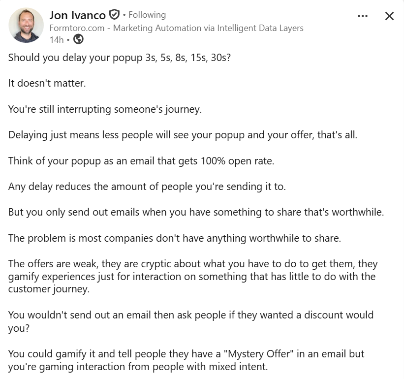 This argument challenges the obsession with delay timing for popups. Instead, it reframes performance around offer strength and user experience. Whether shown instantly or delayed, the real driver is whether the offer is compelling and aligned with the visitorâs intent, not the timing itself.