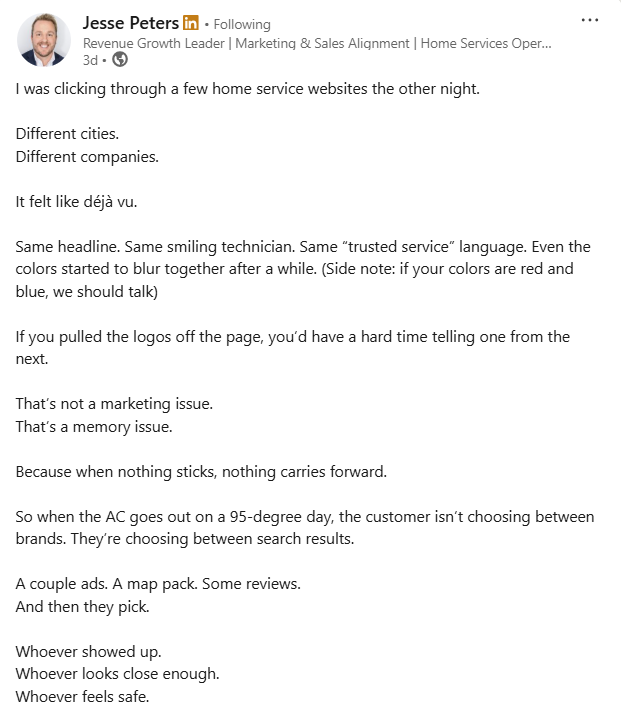 This post argues that the lack of differentiation turns brands into interchangeable options. When customers donât remember you before they need you, the decision defaults to platforms like Google or Meta. At that point, youâre competing on proximity, price, and availability instead of brand preference.