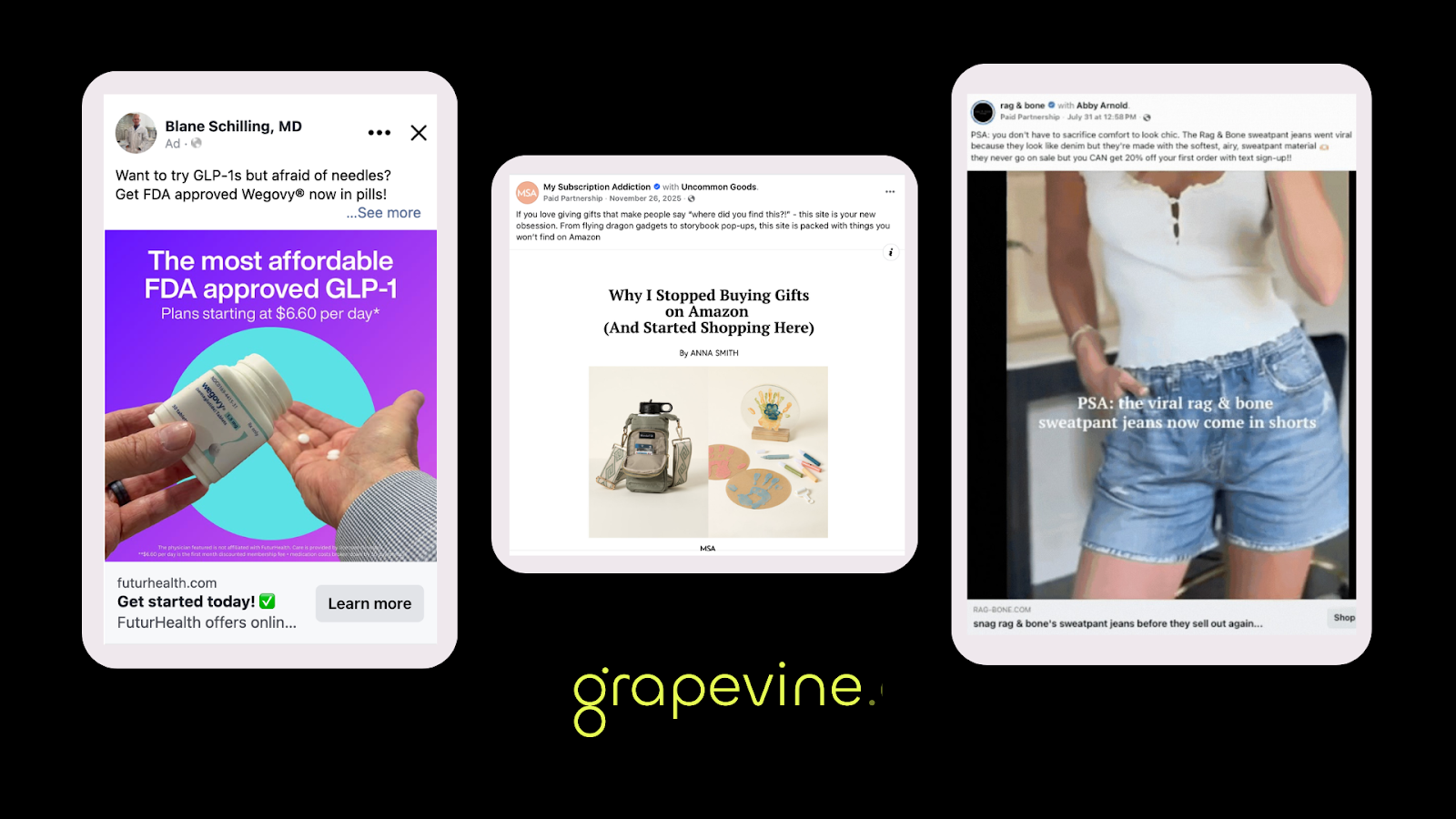 Grapevine ads outperform branded creative by 25%+ across platforms. Consistently, not occasionally.