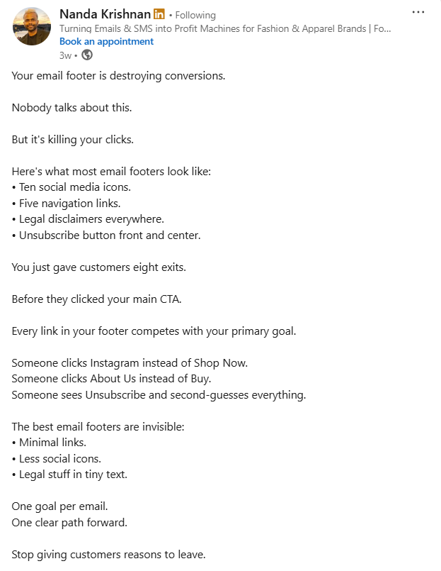 Most email footers accidentally create a maze of distractions — social icons, navigation menus, disclaimers, and a giant unsubscribe link. Each one becomes an exit people can take before clicking your main CTA, and every exit steals revenue by pulling attention away from the action that actually matters.