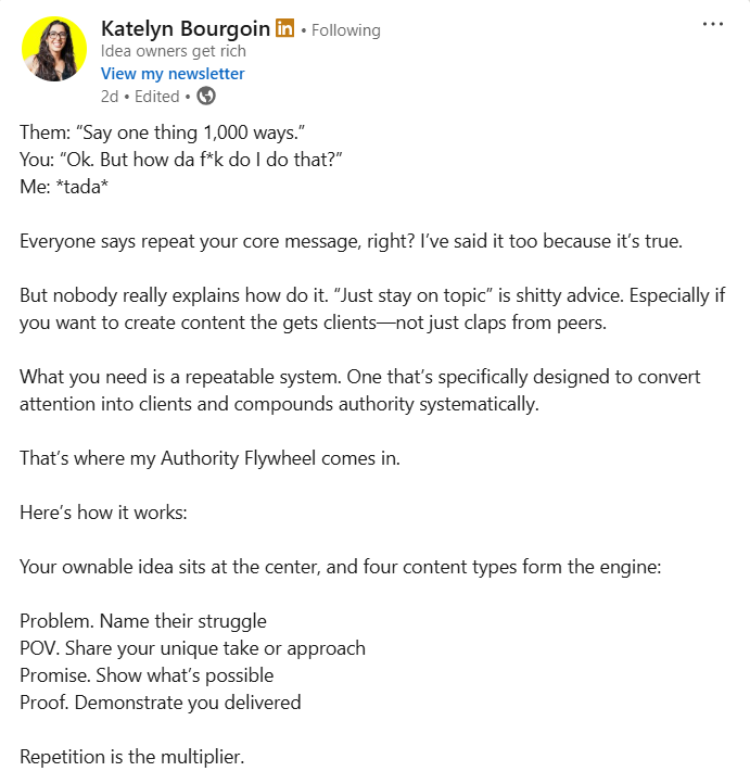 Instead of repeating identical posts, creators rotate four angles around that idea: problem identification, unique perspective, aspirational outcome, and proof of results. Each post reinforces the same intellectual territory while keeping the format and narrative fresh.