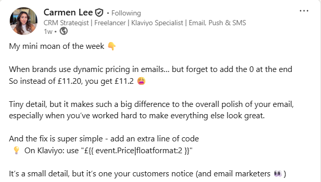 This call-out is about a small but noticeable mistake: dynamic pricing that outputs £11.2 instead of a clean £11.20. It seems minor, but it instantly makes an otherwise polished email feel rushed or unprofessional, especially when the rest of the design looks premium.