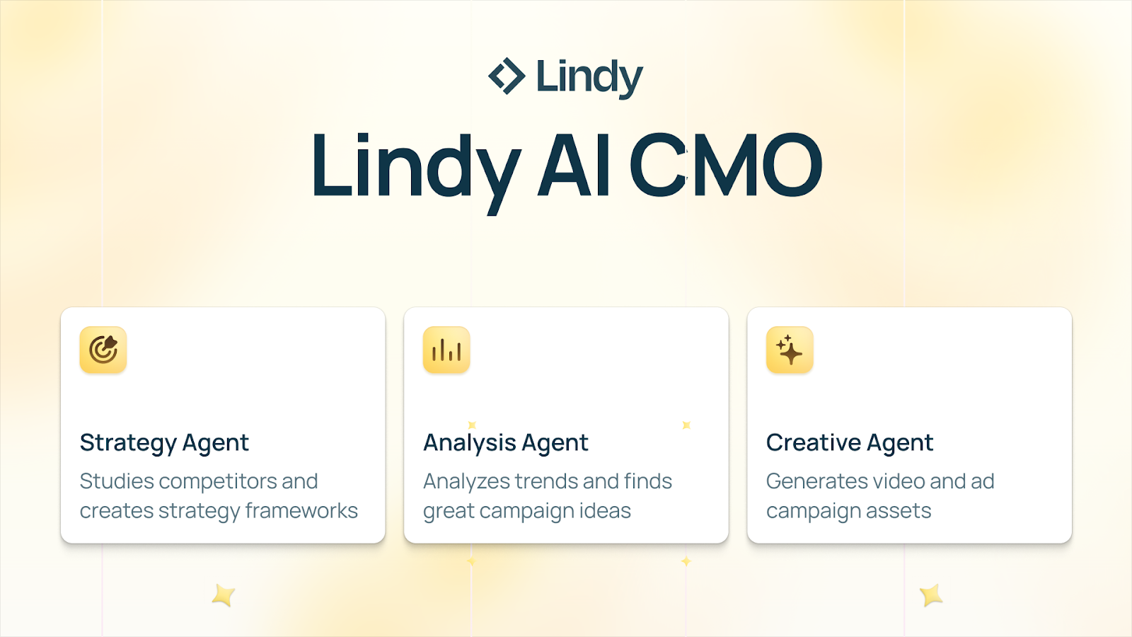 Lindy handles the entire chain, research, strategy, analysis, briefs, creative assets, organization, without adding a single person to your payroll.