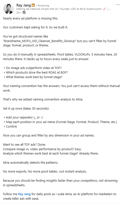 Most ad platforms show performance, but they cannot slice it by the metadata already inside your naming convention. So teams export, spreadsheets, pivot, and waste hours just to answer basic questions like format vs funnel stage or theme vs product.