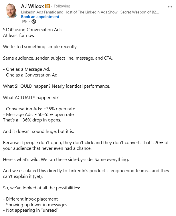 Where it needs balance: Results may vary by account, audience, or timing. Conversation Ads still offer features like retargeting that can drive long-term value. Testing across contexts is necessary before fully shifting formats.